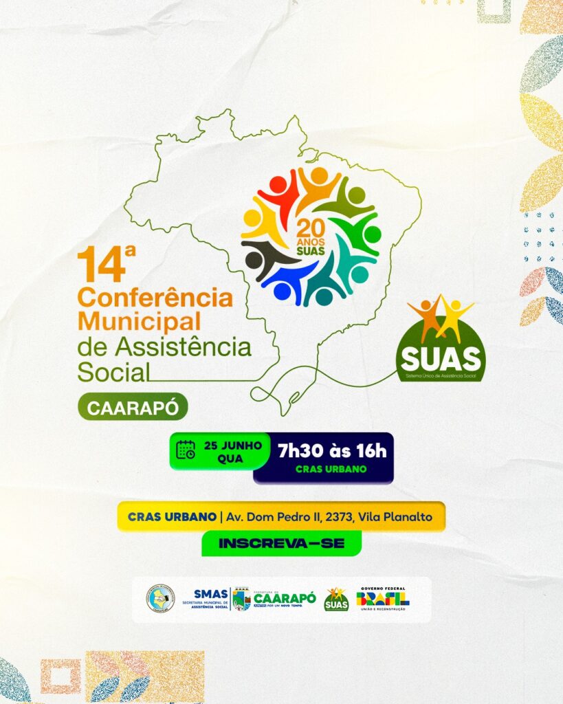 O município de Caarapó se mobiliza para um dos eventos mais importantes no campo da assistência social. No próximo dia 25 de junho, das 7h30 às 16h, será realizada a 14ª Conferência Municipal de Assistência Social, nas dependências do CRAS Urbano, localizado na Rua Dom Pedro II, nº 2373.