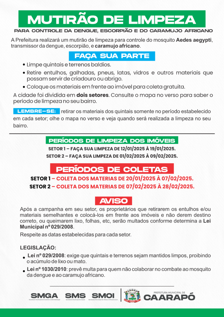 A Prefeitura realizará um mutirão de limpeza para o controle do mosquito Aedes aegypti, transmissor da dengue, de escorpiões e do caramujo africano. Essa ação é essencial para proteger a saúde de toda a população, prevenindo doenças graves e eliminando pragas que representam riscos à população. O Aedes aegypti é responsável pela transmissão de doenças como dengue, zika e chikungunya, que podem causar complicações graves e, em alguns casos, levar a óbito. Além disso, escorpiões representam um perigo significativo, especialmente para crianças e idosos, devido ao veneno que pode provocar acidentes sérios. O caramujo africano, por sua vez, é uma espécie invasora que não apenas ameaça o equilíbrio ambiental, mas também pode transmitir parasitas causadores de doenças como a meningite eosinofílica.