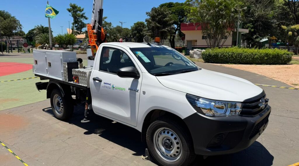 A Prefeitura Municipal de Caarapó realizou a entrega de um veículo tipo caminhonete com cesto aéreo isolado, totalmente equipado para atender às demandas da Secretaria Municipal de Planejamento, Projetos, Habitação e Controle Urbano, especialmente nos serviços de manutenção da rede de iluminação pública do município.