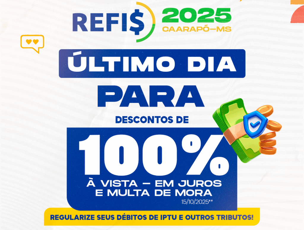 A Prefeitura de Caarapó reforça o alerta aos contribuintes: esta quarta-feira, 15 de outubro de 2025, é o último dia para garantir 100% de desconto em juros e multa de mora ao aderir ao Programa de Recuperação Fiscal – Refis 2025.